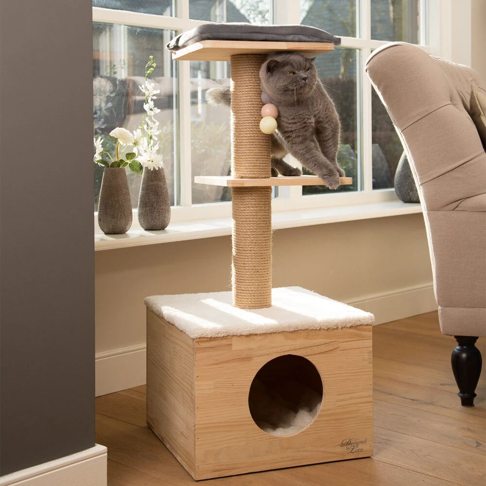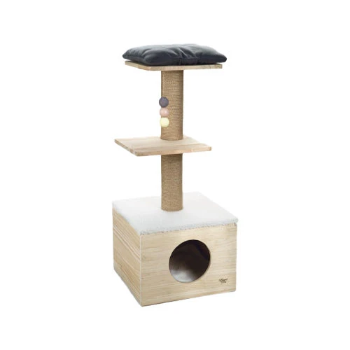 Kamina bietet Ihrer Katze alle Annehmlichkeiten. Es gibt mehrere weiche Liegeplätze, einen Kratzbaum aus Sisalseil und einen Spielball. Unten am Kratzbaum steht ein kleines Haus mit einer weichen Oberfläche, ideal für ein Nickerchen. Das Sisalseil sorgt dafür, dass die Nägel Ihrer Katze beim Kratzen geschärft werden. Kratzmöbel Designed by Lotte ist das Luxusmöbel für Ihre Katze.