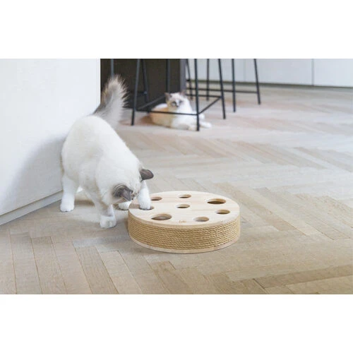 Das Designed by Lotte Raya Katzenspielzeug bietet Ihrer Katze endlosen Spaß. Dieses stilvolle und herausfordernde Katzenspielzeug ist aus strapazierfähigem Gummibaumholz gefertigt und verfügt über mehrere Löcher an der Oberseite, durch die sich Ihre Katze bewegen und versuchen kann, die 2 im Inneren versteckten Holzkugeln zu fangen. Dies stimuliert den Jagdinstinkt Ihrer Katze und hält sie aktiv. Außerdem ist das Spielzeug mit schützenden Füßen an der Unterseite ausgestattet, so dass der Fußboden beim Spielen gut geschützt ist.