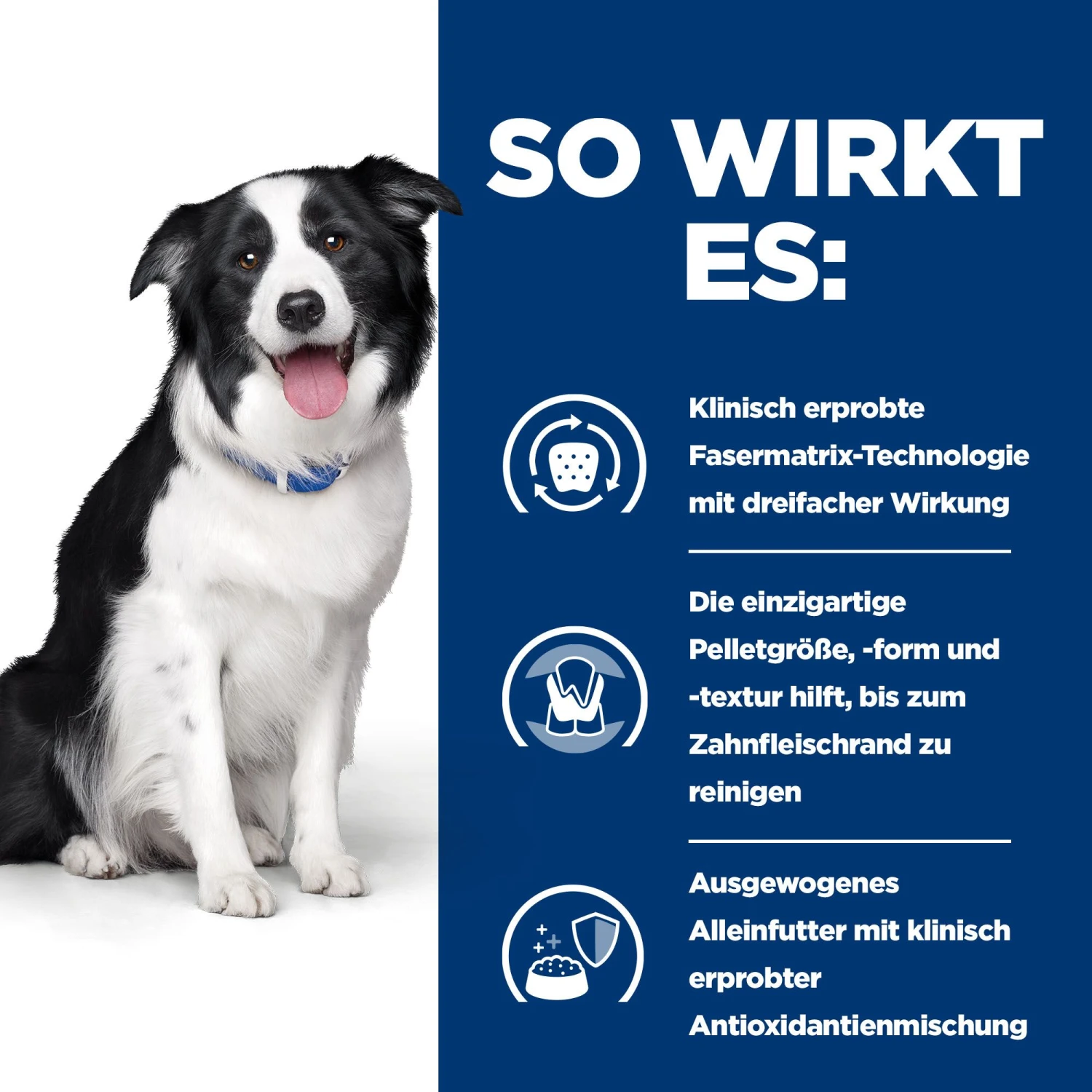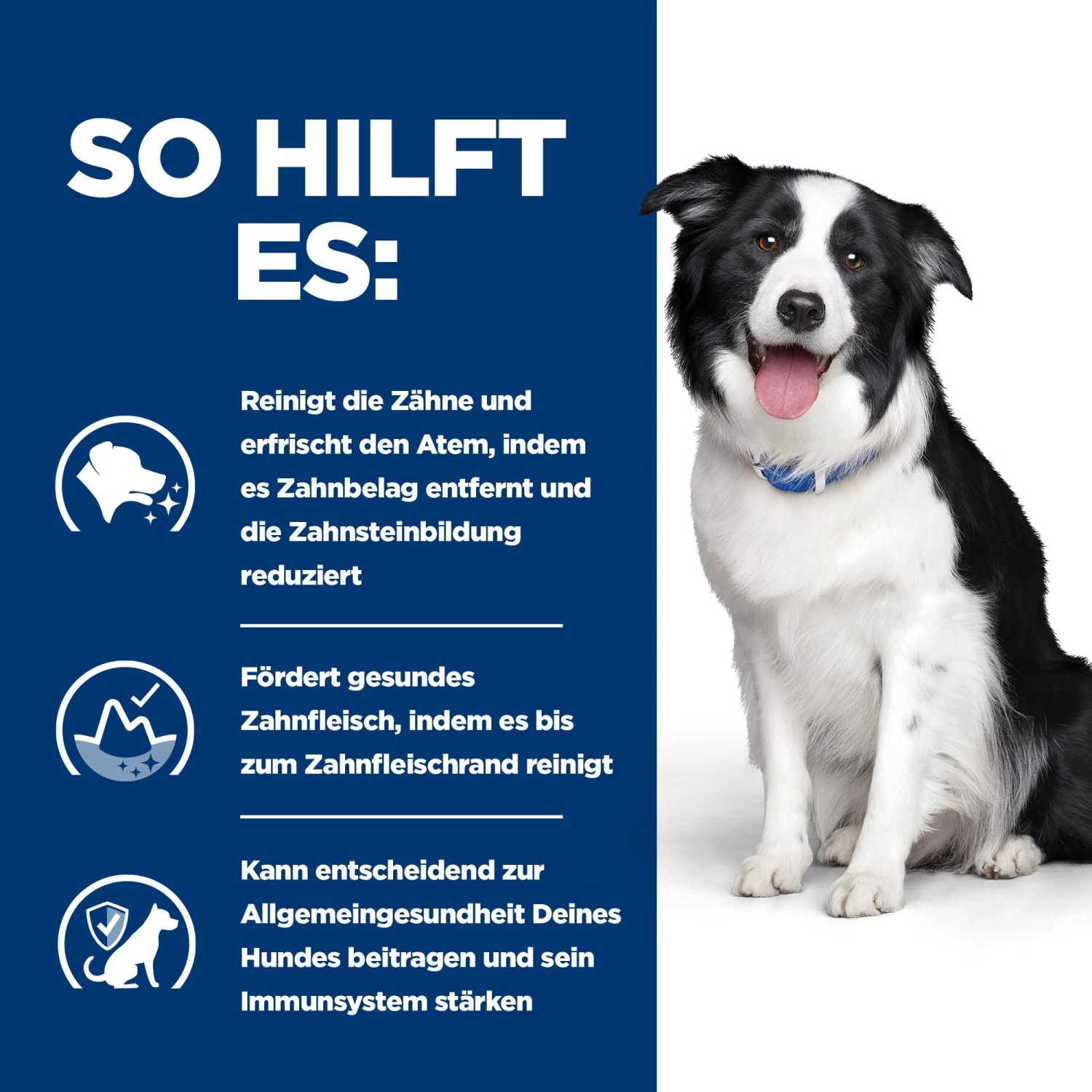 Hill’s t/d Canine ist klinisch bewiesen Gingivitis und die Entwicklung von Zahnbelag, Zahnverfärbung und Zahnstein zu reduzieren. Hill’s t/d Canine ist am effektivsten, wenn es, auf sauberen Zähnen verwendet wird (nach professioneller Zahnreinigung), als einziges Erhaltungsfutter gefüttert wird, trocken gefüttert wird (Zugabe von Wasser verhindert effektive Reinigung). Es enthält weder Mineralabrasiva noch aktive Chemikalien. Andere Methoden zur Zahnpflege zu Hause können zusätzlich erfolgen, z.B. regelmäßiges Putzen mit einer Zahnbürste.