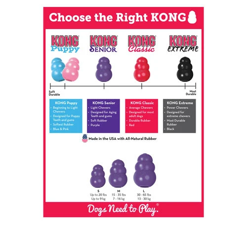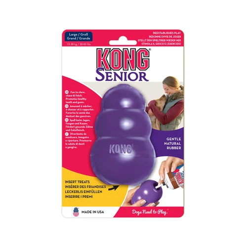 Wenn ein Hund älter wird, kann das Kauen auf Spielzeugen etwas mühsamer werden. Aus diesem Grund hat KONG eine Variante von dem KONG Classic für den älteren Hund auf den Markt gebracht. Der KONG Senior ist auf das alternde Gebiss von einem älteren Hund angepasst. Das Spielzeug ist aus dem charakteristischen, stabilen und natürlichen Kautschuk von dem KONG Classic gefertigt, jedoch sehr viel weicher. Dadurch kann der Hund leichter auf dem Spielzeug kauen. Ebenso wie den KONG Classic können Sie auch den KONG Senior mit Brocken, Leckereien oder KONG Stuff’N füllen. Der KONG Senior ist in drei Größen erhältlich: Small, Medium und Large.