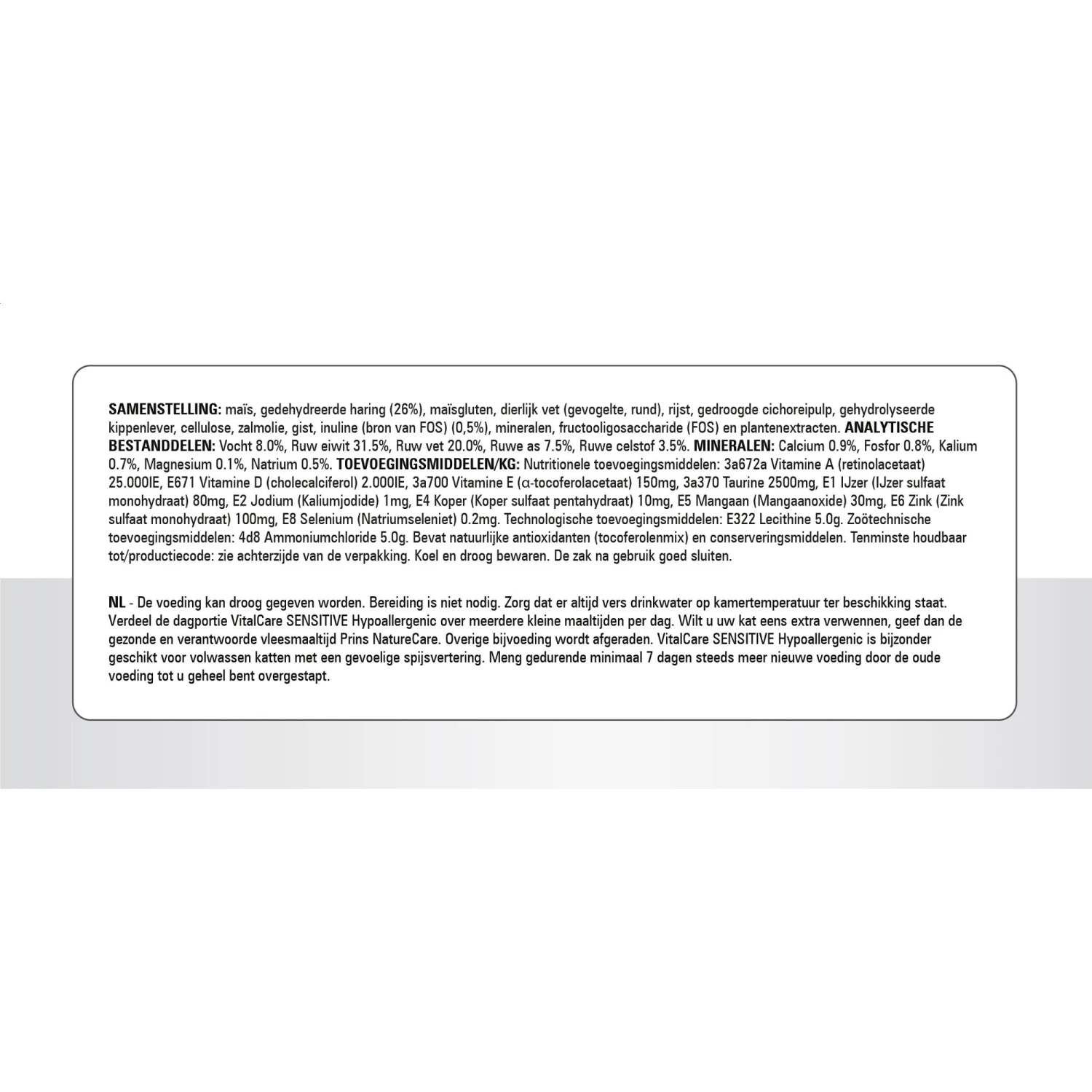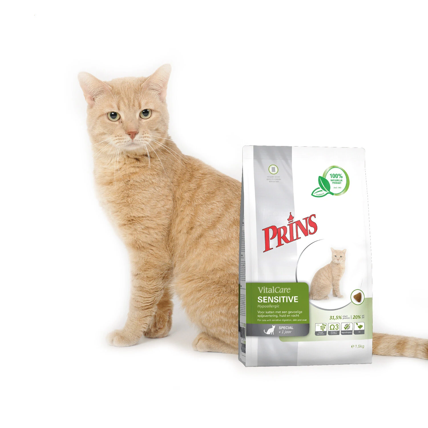 Prins VitalCare Cat Sensitive Hypoallergic ist ein köstliches Katzenfutter für erwachsene Katzen mit einer empfindlichen Verdauung, Haut und Fell. Dieses hochwertige Futter enthält eine ausgewählte Proteinquelle, nämlich Fisch. Dieser Fisch kann das Risiko einer Überempfindlichkeitsreaktion verringern. Der Zusatz von Omega-3-Fettsäuren trägt zu einem besseren Zustand der Haut und einem glänzenden Fell bei. Diese Zutaten in diesem Futter von Prins sorgen auch dafür, dass es sehr gut schmeckt.