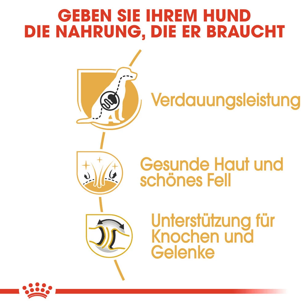 Royal Canin German Shepherd Adult ist speziell auf die besonderen Ernährungsbedürfnisse ausgewachsener Deutscher Schäferhunde ab 15 Monaten abgestimmt. Dieses Futter enthält sorgfältig ausgewählte, hochverdauliche Proteine (L.I.P.) sowie spezielle Fasern, die die Verdauung fördern und zu einer ausgewogenen Darmflora beitragen. Darüber hinaus helfen Omega-3-Fettsäuren (EPA & DHA), die Hautbarriere zu unterstützen und das Fell gesund und glänzend zu halten. Da der Deutsche Schäferhund eine aktive Rasse ist, ist das Futter mit Nährstoffen angereichert, die gesunde Knochen und Gelenke unterstützen. Dies trägt dazu bei, das hohe Aktivitätsniveau dieser Rasse optimal zu erhalten. Zudem unterstützt die Rezeptur den Erhalt eines gesunden Gewichts. So erhält Ihr Deutscher Schäferhund täglich die richtige Ernährung für Vitalität und Wohlbefinden.