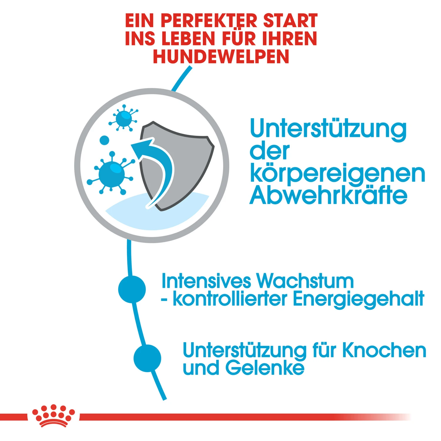 Während ihrer intensiven Wachstumsphase benötigen Welpen sehr großer Rassen ausreichend Kalorien und die richtigen Nährstoffe für ein gesundes Wachstum. Während dieser Zeit entwickeln sich die Knochen, Muskeln, Sinne und das Nervensystem des Welpen weiter. Außerdem nimmt die Menge an Antikörpern, die der Welpe über die erste Muttermilch, das so genannte Kolostrum, erhält, ab. Daher sind unter anderem optimale Mengen der richtigen Proteine erforderlich, um das eigene Immunsystem des Welpen aufzubauen.