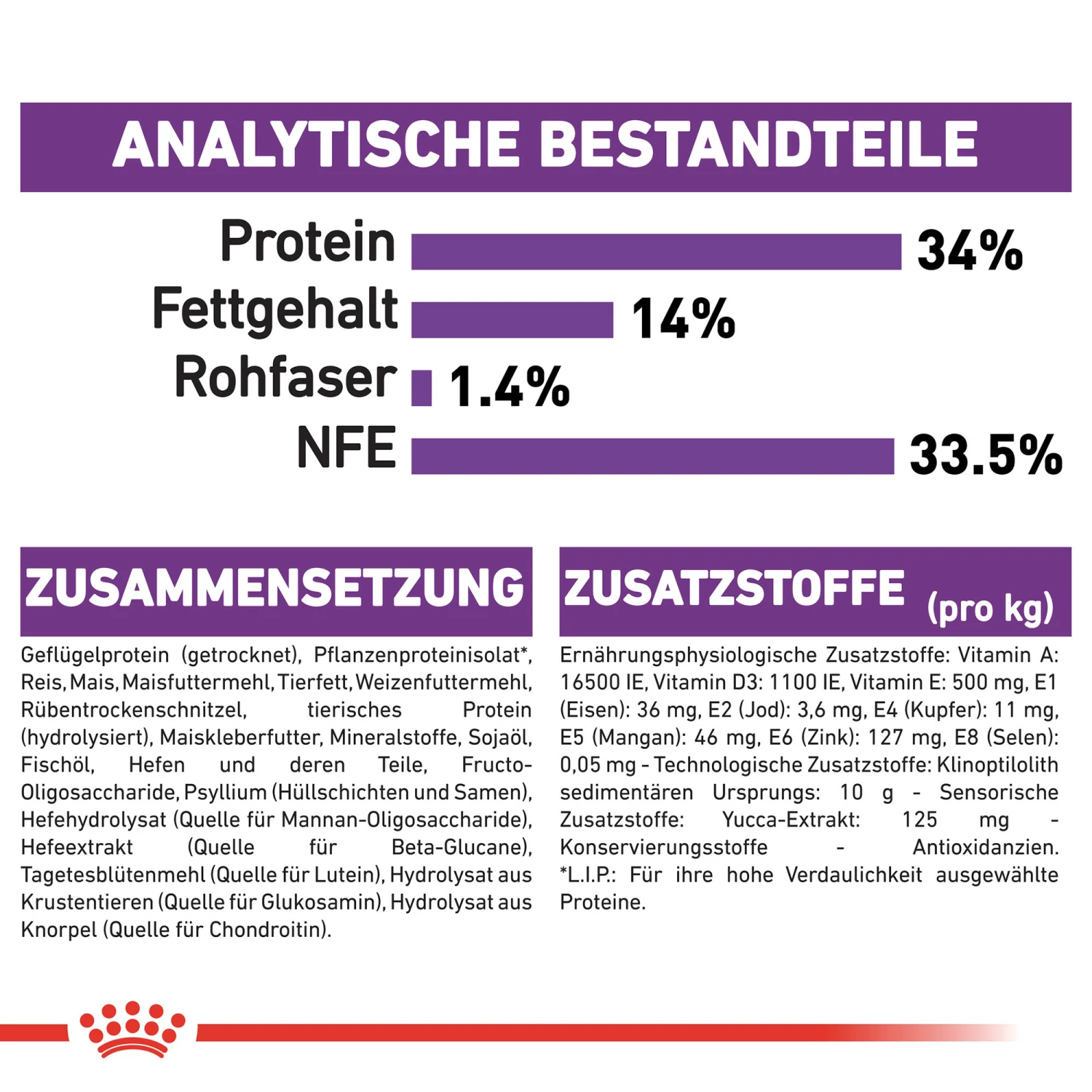 - Präbiotika und hochverdauliche Proteine zur Unterstützung eines gesunden Gleichgewichts der Darmflora