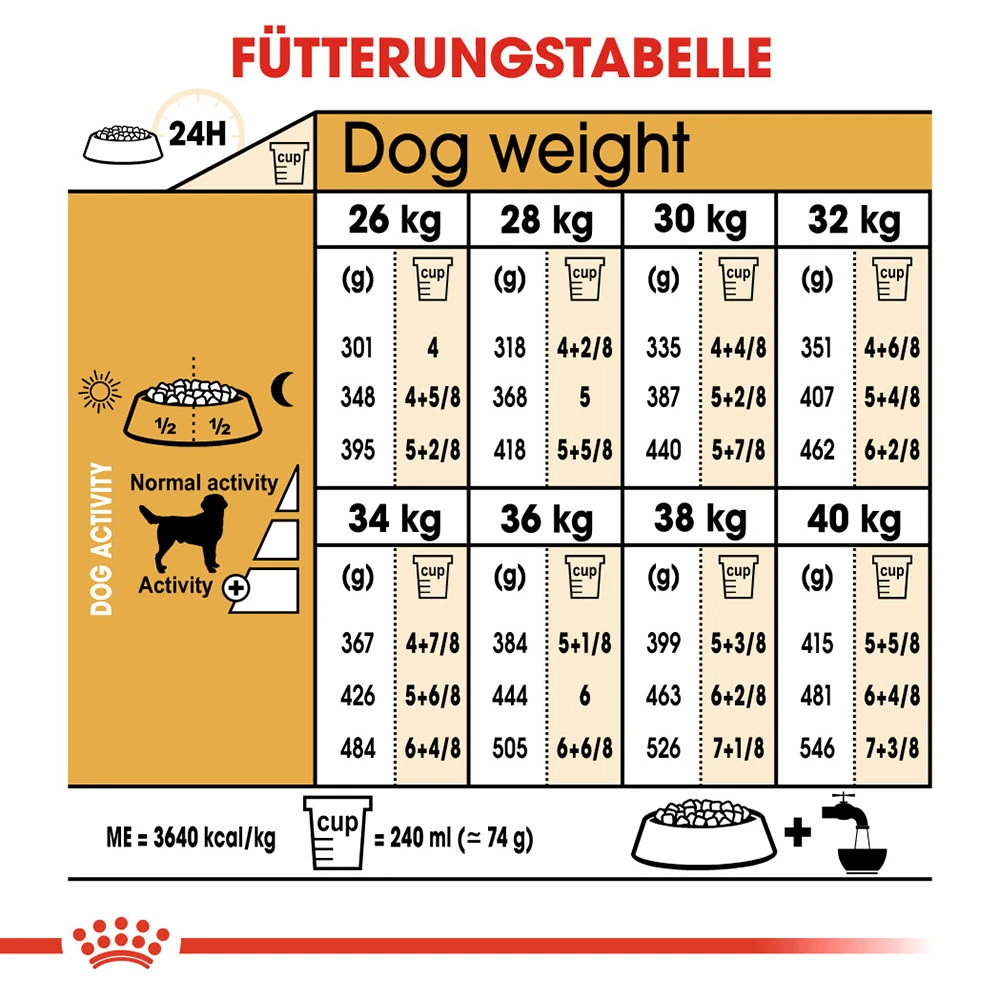 Sind Sie auf der Suche nach dem richtigen Futter für Ihren Labrador Retriever? Royal Canin Labrador Retriever Adult ist speziell auf die Bedürfnisse eines Labrador Retrievers abgestimmt. Dieses Futter unterstützt zum Beispiel ein schönes Fell, starke Knochen und geschmeidige Gelenke. Das Futter enthält Omega-3-Fettsäuren, darunter EPA und DHA, sowie Borretschöl. Diese Nährstoffe tragen alle zur Unterstützung einer gesunden Hautbarrierefunktion bei, was sich positiv auf die Gesundheit des Fells Ihres Hundes auswirkt. Durch die Kombination von Fettsäuren und einer Anreicherung von Taurin unterstützt dieses Futter auch die gesunde Herzfunktion Ihres Hundes. Darüber hinaus ermöglicht dieses Futter Ihrem Hund, durch den angepassten Kaloriengehalt des Futters das Idealgewicht zu halten. Der spezielle runde Kropf mit Loch regt Ihren Hund an, gut zu kauen und in aller Ruhe zu fressen.