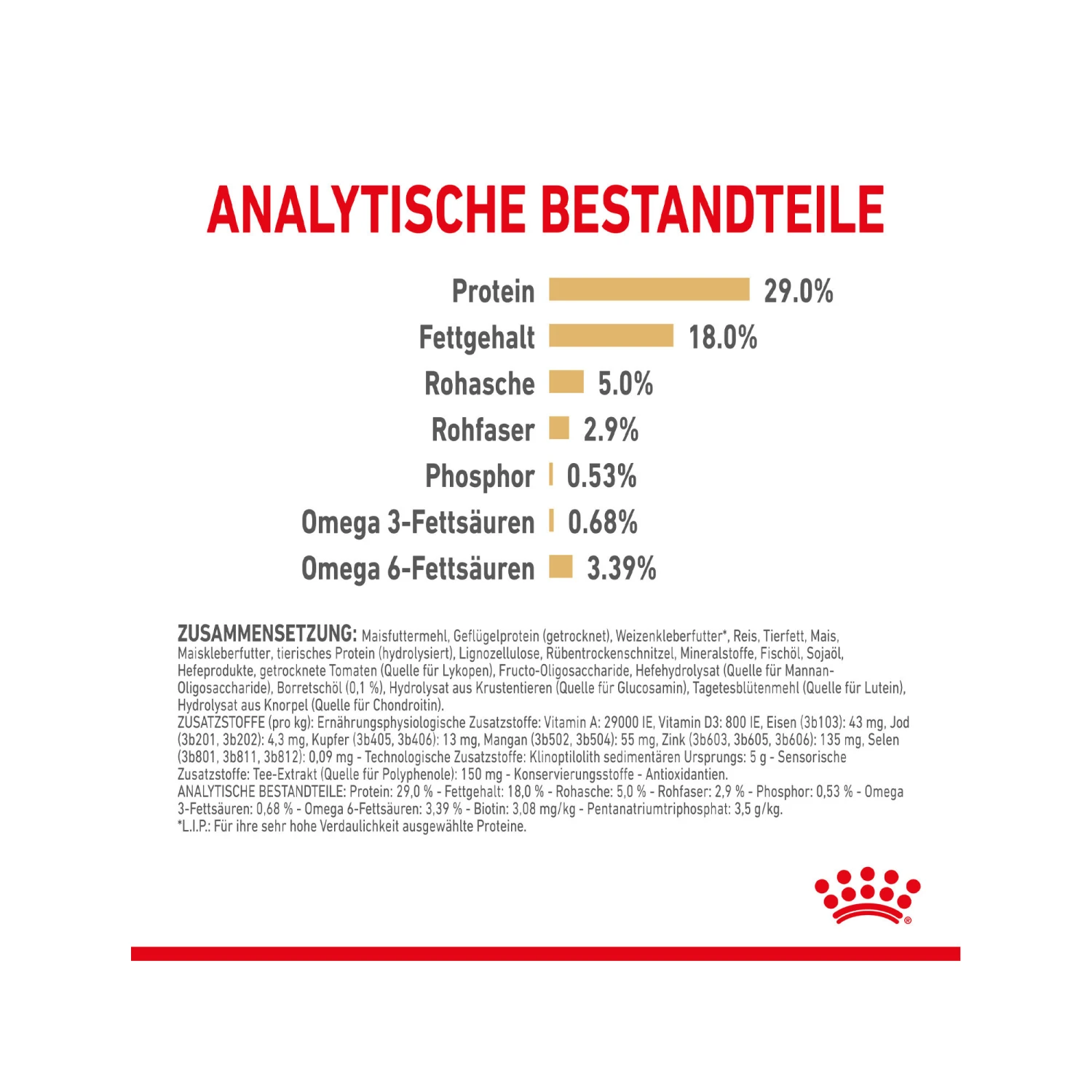 Maismehl, dehydrierte Geflügelproteine, Weizengluten*, Reis, tierische Fette, Mais, Maiskleber, Hydrolysat von tierischen Proteinen, pflanzliche Fasern, Rübenschnitzel, Mineralien, Fischöl, Sojaöl, Hefeprodukte, getrocknete Tomatenschnitzel (Lycopinquelle), Fructo-Oligosaccharide, Hefe-Hydrolysat (Quelle für Manno-Oligosaccharide), Borretschöl (0,1%), Krustentier-Hydrolysat (Quelle für Glucosamin), (afrikanischer) Tagetes-Extrakt (Quelle für Lutein), Knorpel-Hydrolysat (Quelle für Chondroitin)