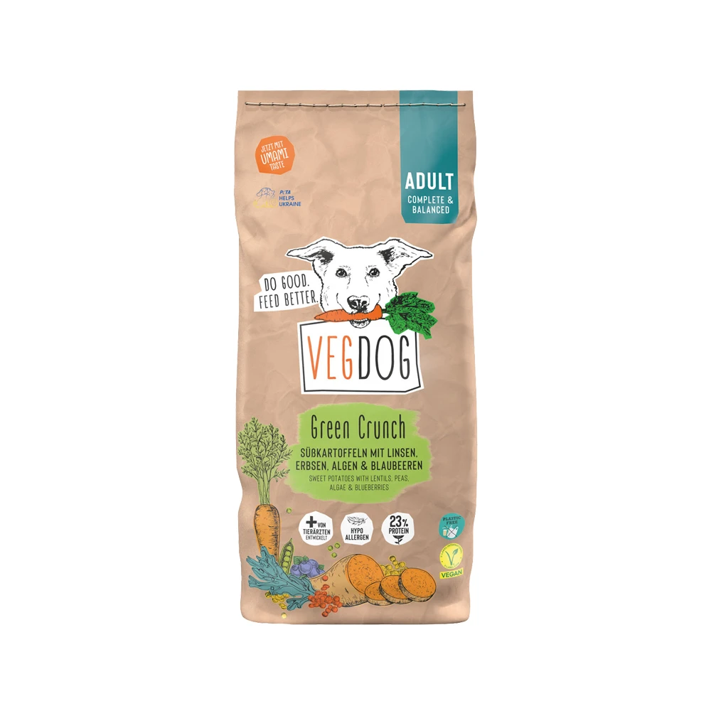VegDog Green Crunch Hundefutter ist die perfekte Ergänzung für die tägliche Ernährung Ihres ausgewachsenen Hundes. Dieses Trockenfutter bietet eine gesunde und leicht verdauliche Proteinquelle. Es ist für alle erwachsenen Hunde geeignet, auch wenn Ihr Hund mit einem empfindlichen Magen zu kämpfen hat oder als Eliminationsdiät. Die Brocken bieten eine perfekte Tagesgrundlage und können beliebig mit anderen Futtersorten kombiniert werden. Ihr Hund profitiert auch von den zusätzlichen Mineralien, dem Gemüse und dem Obst. Dank der hervorragenden Zusammensetzung von VegDog Green Crunch wird es Ihrem Hund an keinen Nährstoffen mangeln.