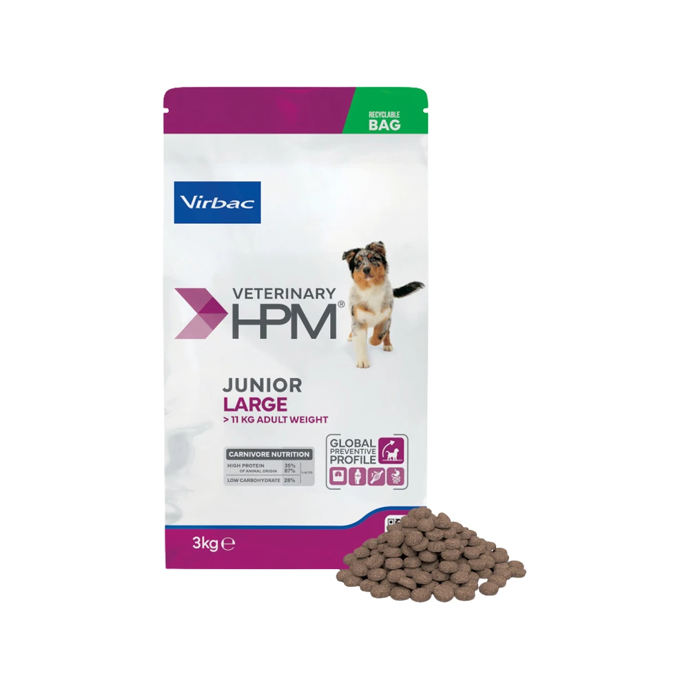 Junior Dog – Large aus der Produktlinie Virbac Veterinary HPM ist ein Alleinfutter, das für die Junghunde von großen Rassen in einem Lebensalter von 8 bis 18 Monaten geeignet ist. Die Zusammenstellung von dem Futter ist speziell auf die Bedürfnisse von Hunden großer Rassen abgestimmt. Das neue Gesundheitsfutter basiert auf einer Formulierung mit einem geringen Kohlenhydratgehalt und hohen Proteingehalt. Die Reduzierung von Stärke und Kohlenhydraten, sowie die Erhöhung von tierischen Fetten bringen das Futter wieder zurück zu den natürlichen Bedürfnissen von den Fleischfressern.