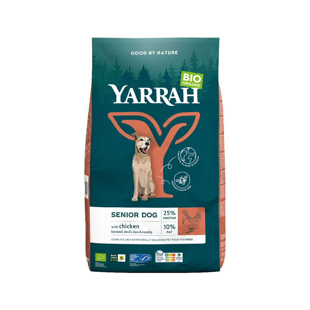„Yarrah Organisches Hundefutter Senior mit Huhn, Fisch und Kräuter eignet sich besonders für ältere Hunde ab 7 Jahren. Diese Stücke sind biologisch und angereichert mit den natürlichen Zutaten Teufelskralle, Schachtelhalm und Hagebutten. Diese Kräuter können positiv auf die Gelenke älterer Hunde wirken. Yarrah Organic Dog Food Senior ist jetzt auch im 10kg-Sack erhältlich. Diese Variante enthält nur Biologische Hühnchen und Kräuter.